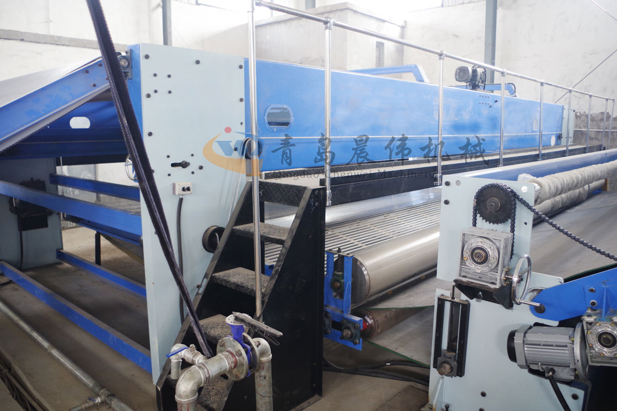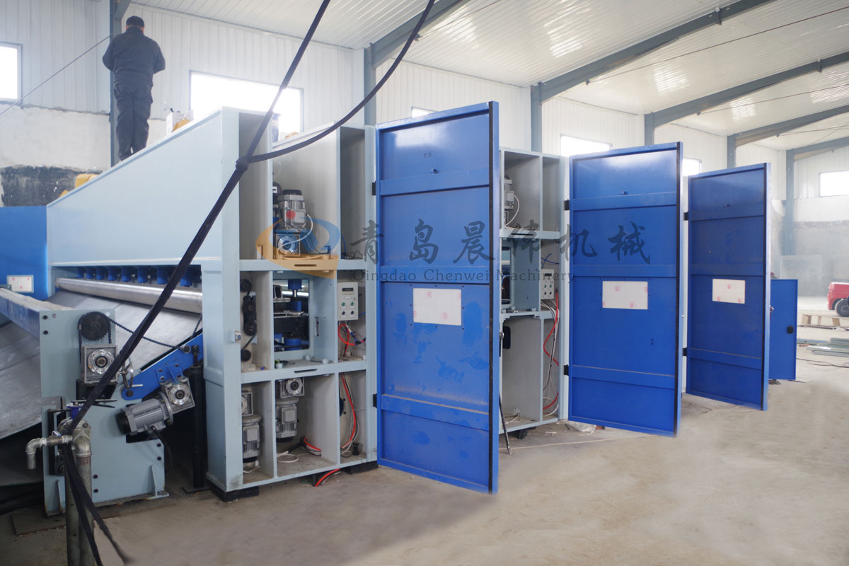 5. CWPW-鋪網機:用于將梳理纖網通過移動小車交叉折疊為所需幅寬和定量的多層纖網,以供后道工序使用。鋪網輥采用特殊結構,加裝壓網輥和導流板,不飄網不起皺,五只大功率電機精確控制各部件的運動,電動輸出簾高度調節裝置